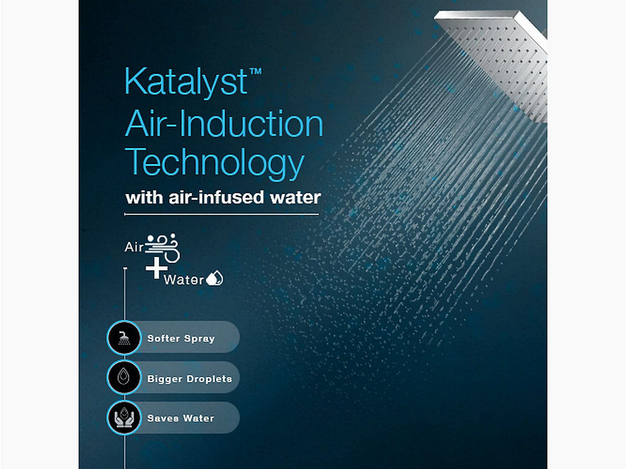 This Rainduet® contemporary square single-function rainhead is the perfect blend of simple design and powerful efficiency. Enjoy a shower that simulates the soaking deluge of a warm summer downpour. This rainhead features Katalyst™ air-induction technology, which efficiently mixes air and water to produce large water droplets and deliver a powerful, thoroughly drenching overhead shower experience. Its clean good looks and durable finish coordinate with many other KOHLER® faucets and accessories.